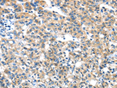 The image on the left is immunohistochemistry of paraffin-embedded Human liver cancer tissue using CSB-PA886920(GZMK Antibody) at dilution 1/20, on the right is treated with synthetic peptide. (Original magnification: ×200)