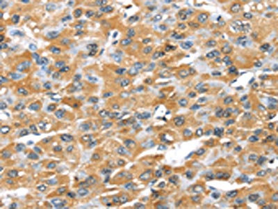 The image on the left is immunohistochemistry of paraffin-embedded Human liver cancer tissue using CSB-PA057029(GZMK Antibody) at dilution 1/20, on the right is treated with synthetic peptide. (Original magnification: ×200)
