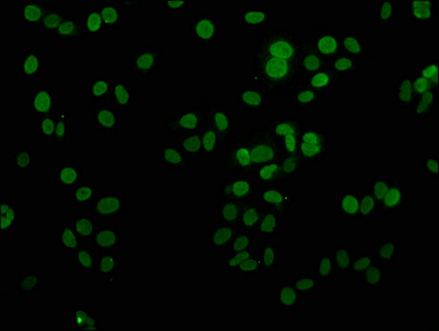 Immunofluorescence staining of HepG2 cells with CSB-PA010087OA81nme1HU at 1:2.5, counter-stained with DAPI. The cells were fixed in 4% formaldehyde, permeabilized using 0.2% Triton X-100 and blocked in 10% normal Goat Serum. The cells were then incubated with the antibody overnight at 4°C. The secondary antibody was Alexa Fluor 488-congugated AffiniPure Goat Anti-Rabbit IgG(H+L).
