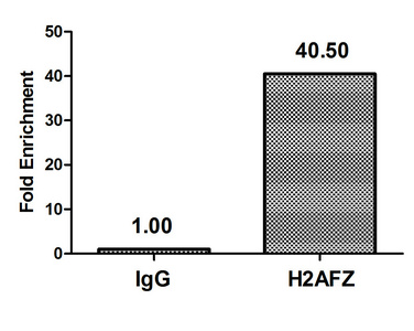 Chromatin Immunoprecipitation Hela (4*106) were treated with Micrococcal Nuclease, sonicated, and immunoprecipitated with 5µg anti-H2AFZ (CSB-PA010100OA04nme1HU) or a control normal rabbit IgG. The resulting ChIP DNA was quantified using real-time PCR with primers against the β-Globin promoter.