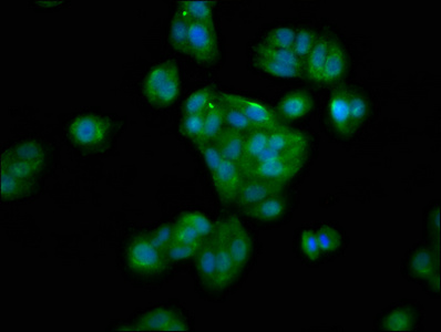 Immunofluorescence staining of HepG2 cells with CSB-PA891938LA01HU at 1:100, counter-stained with DAPI. The cells were fixed in 4% formaldehyde, permeabilized using 0.2% Triton X-100 and blocked in 10% normal Goat Serum. The cells were then incubated with the antibody overnight at 4°C. The secondary antibody was Alexa Fluor 488-congugated AffiniPure Goat Anti-Rabbit IgG(H+L).