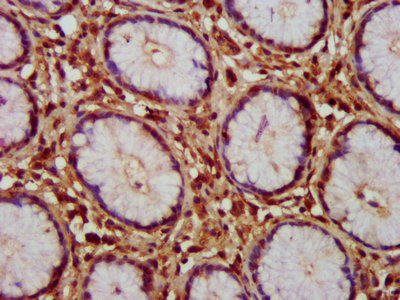 IHC image of CSB-PA03515A0Rb diluted at 1:150 and staining in paraffin-embedded human gastric cancer performed on a Leica BondTM system. After dewaxing and hydration, antigen retrieval was mediated by high pressure in a citrate buffer (pH 6.0). Section was blocked with 10% normal goat serum 30min at RT. Then primary antibody (1% BSA) was incubated at 4°C overnight. The primary is detected by a biotinylated secondary antibody and visualized using an HRP conjugated SP system.