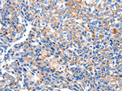 The image on the left is immunohistochemistry of paraffin-embedded Human ovarian cancer tissue using CSB-PA076798(HCN2 Antibody) at dilution 1/80, on the right is treated with synthetic peptide. (Original magnification: ×200)