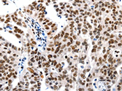 The image on the left is immunohistochemistry of paraffin-embedded Human lung cancer tissue using CSB-PA134980(HDAC1 Antibody) at dilution 1/20, on the right is treated with synthetic peptide. (Original magnification: ×200)