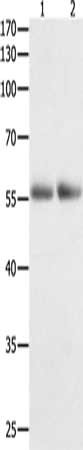 Gel: 10%SDS-PAGE, Lysate: 40 μg, Lane 1-2: Human colon tissue, Human kidney cancer tissue, Primary antibody: CSB-PA134980(HDAC1 Antibody) at dilution 1/400, Secondary antibody: Goat anti rabbit IgG at 1/8000 dilution, Exposure time: 2 minutes