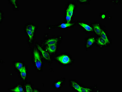 Immunofluorescent analysis of Hela cells using CSB-PA010236LA01HU at dilution of 1:100 and Alexa Fluor 488-congugated AffiniPure Goat Anti-Rabbit IgG(H+L)
