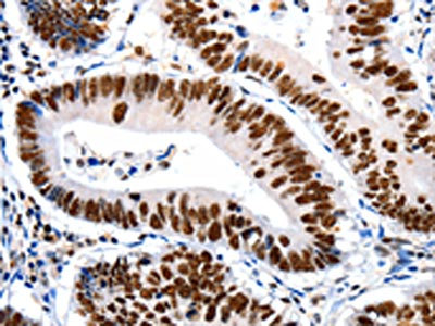 The image on the left is immunohistochemistry of paraffin-embedded Human colon cancer tissue using CSB-PA260045(HDAC2 Antibody) at dilution 1/25, on the right is treated with synthetic peptide. (Original magnification: ×200)