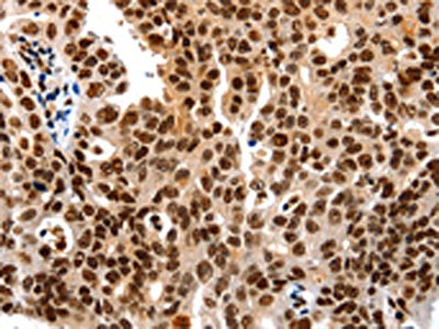 The image on the left is immunohistochemistry of paraffin-embedded Human ovarian cancer tissue using CSB-PA260045(HDAC2 Antibody) at dilution 1/25, on the right is treated with synthetic peptide. (Original magnification: ×200)