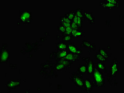 Immunofluorescent analysis of Hela cells using CSB-PA010239LA01HU at dilution of 1:100 and Alexa Fluor 488-congugated AffiniPure Goat Anti-Rabbit IgG(H+L)