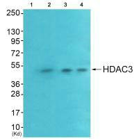 Western blot analysis of extracts from HeLa cells (Lane 2), A549 cells (Lane 3) and HepG2 cells (Lane 4), using HDAC3 antiobdy. The lane on the left is treated with systhesized peptide.