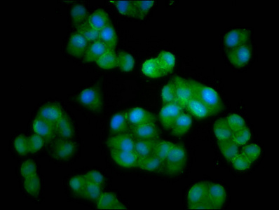Immunofluorescence staining of Hela cells with CSB-PA883435LA01HU at 1:33, counter-stained with DAPI. The cells were fixed in 4% formaldehyde, permeabilized using 0.2% Triton X-100 and blocked in 10% normal Goat Serum. The cells were then incubated with the antibody overnight at 4°C. The secondary antibody was Alexa Fluor 488-congugated AffiniPure Goat Anti-Rabbit IgG(H+L).