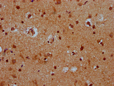 IHC image of CSB-PA729212LA01HU diluted at 1:400 and staining in paraffin-embedded human brain tissue performed on a Leica BondTM system. After dewaxing and hydration, antigen retrieval was mediated by high pressure in a citrate buffer (pH 6.0). Section was blocked with 10% normal goat serum 30min at RT. Then primary antibody (1% BSA) was incubated at 4°C overnight. The primary is detected by a biotinylated secondary antibody and visualized using an HRP conjugated SP system.