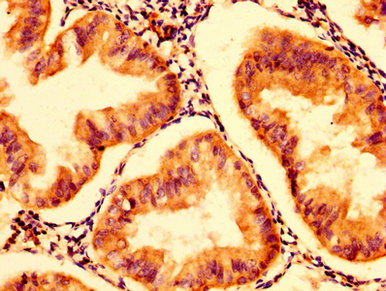IHC image of CSB-PA12259A0Rb diluted at 1:300 and staining in paraffin-embedded human endometrial cancer performed on a Leica BondTM system. After dewaxing and hydration, antigen retrieval was mediated by high pressure in a citrate buffer (pH 6.0). Section was blocked with 10% normal goat serum 30min at RT. Then primary antibody (1% BSA) was incubated at 4°C overnight. The primary is detected by a biotinylated secondary antibody and visualized using an HRP conjugated SP system.