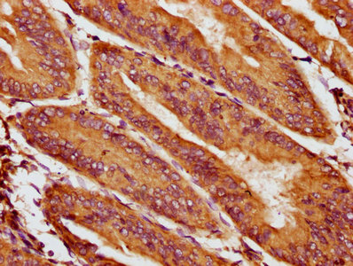 IHC image of CSB-PA623921LA01HU diluted at 1:400 and staining in paraffin-embedded human endometrial cancer performed on a Leica BondTM system. After dewaxing and hydration, antigen retrieval was mediated by high pressure in a citrate buffer (pH 6.0). Section was blocked with 10% normal goat serum 30min at RT. Then primary antibody (1% BSA) was incubated at 4°C overnight. The primary is detected by a biotinylated secondary antibody and visualized using an HRP conjugated SP system.