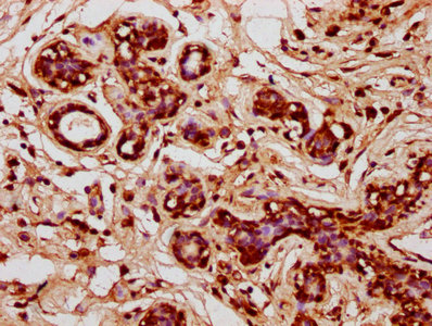 IHC image of CSB-PA623921LA01HU diluted at 1:400 and staining in paraffin-embedded human breast cancer performed on a Leica BondTM system. After dewaxing and hydration, antigen retrieval was mediated by high pressure in a citrate buffer (pH 6.0). Section was blocked with 10% normal goat serum 30min at RT. Then primary antibody (1% BSA) was incubated at 4°C overnight. The primary is detected by a biotinylated secondary antibody and visualized using an HRP conjugated SP system.