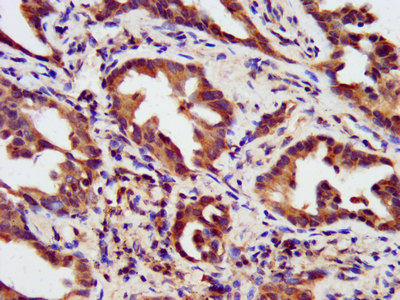 IHC image of CSB-PA803159LA01HU diluted at 1:200 and staining in paraffin-embedded human lung cancer performed on a Leica BondTM system. After dewaxing and hydration, antigen retrieval was mediated by high pressure in a citrate buffer (pH 6.0). Section was blocked with 10% normal goat serum 30min at RT. Then primary antibody (1% BSA) was incubated at 4°C overnight. The primary is detected by a biotinylated secondary antibody and visualized using an HRP conjugated SP system.