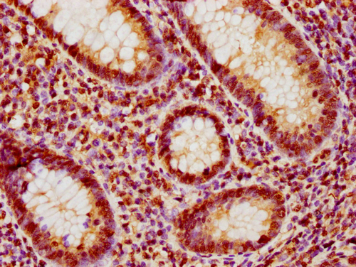 IHC image of CSB-PA010377OA188nphHU diluted at 1:10 and staining in paraffin-embedded human appendix tissue performed on a Leica BondTM system. After dewaxing and hydration, antigen retrieval was mediated by high pressure in a citrate buffer (pH 6.0). Section was blocked with 10% normal goat serum 30min at RT. Then primary antibody (1% BSA) was incubated at 4°C overnight. The primary is detected by a biotinylated secondary antibody and visualized using an HRP conjugated SP system.
