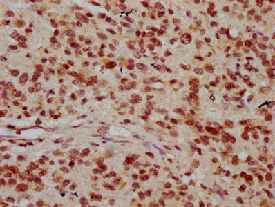 IHC image of CSB-PA010378OA26nhibHU diluted at 1:20 and staining in paraffin-embedded human glioma performed on a Leica BondTM system. After dewaxing and hydration, antigen retrieval was mediated by high pressure in a citrate buffer (pH 6.0). Section was blocked with 10% normal goat serum 30min at RT. Then primary antibody (1% BSA) was incubated at 4°C overnight. The primary is detected by a biotinylated secondary antibody and visualized using an HRP conjugated SP system.