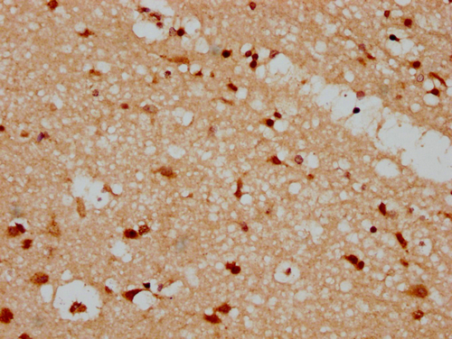 IHC image of CSB-PA010378PA109nforHU diluted at 1:20 and staining in paraffin-embedded human brain tissue performed on a Leica BondTM system. After dewaxing and hydration, antigen retrieval was mediated by high pressure in a citrate buffer (pH 6.0). Section was blocked with 10% normal goat serum 30min at RT. Then primary antibody (1% BSA) was incubated at 4°C overnight. The primary is detected by a biotinylated secondary antibody and visualized using an HRP conjugated SP system.
