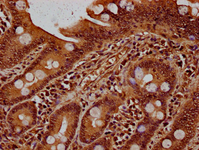 IHC image of CSB-PA010379OA90nbhbHU diluted at 1:20 and staining in paraffin-embedded human small intestine tissue performed on a Leica BondTM system. After dewaxing and hydration, antigen retrieval was mediated by high pressure in a citrate buffer (pH 6.0). Section was blocked with 10% normal goat serum 30min at RT. Then primary antibody (1% BSA) was incubated at 4°C overnight. The primary is detected by a biotinylated secondary antibody and visualized using an HRP conjugated SP system.