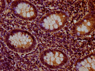 IHC image of CSB-PA010379OA90nbhbHU diluted at 1:20 and staining in paraffin-embedded human appendix tissue performed on a Leica BondTM system. After dewaxing and hydration, antigen retrieval was mediated by high pressure in a citrate buffer (pH 6.0). Section was blocked with 10% normal goat serum 30min at RT. Then primary antibody (1% BSA) was incubated at 4°C overnight. The primary is detected by a biotinylated secondary antibody and visualized using an HRP conjugated SP system.