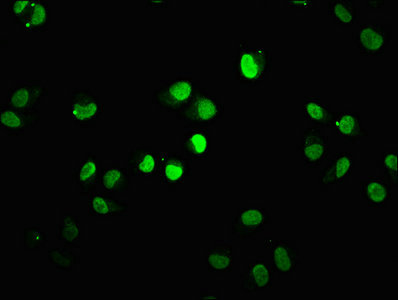 Immunofluorescence staining of Hela cells with CSB-PA010379OA90nbhbHU at 1:7.5, counter-stained with DAPI. The cells were fixed in 4% formaldehyde, permeabilized using 0.2% Triton X-100 and blocked in 10% normal Goat Serum. The cells were then incubated with the antibody overnight at 4°C. The secondary antibody was Alexa Fluor 488-congugated AffiniPure Goat Anti-Rabbit IgG(H+L).