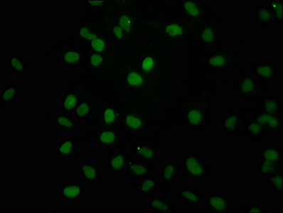 Immunofluorescence staining of Hela cells with CSB-PA010389OA11nme2HU at 1:1, counter-stained with DAPI. The cells were fixed in 4% formaldehyde, permeabilized using 0.2% Triton X-100 and blocked in 10% normal Goat Serum. The cells were then incubated with the antibody overnight at 4°C. The secondary antibody was Alexa Fluor 488-congugated AffiniPure Goat Anti-Rabbit IgG(H+L).