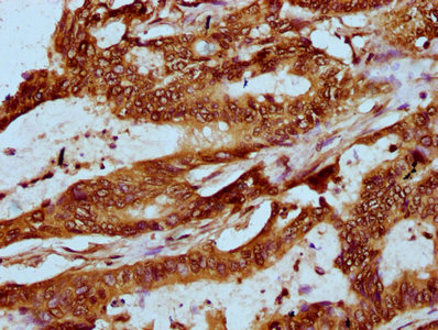 IHC image of CSB-PA010389OA118nforHU diluted at 1:20 and staining in paraffin-embedded human colon cancer performed on a Leica BondTM system. After dewaxing and hydration, antigen retrieval was mediated by high pressure in a citrate buffer (pH 6.0). Section was blocked with 10% normal goat serum 30min at RT. Then primary antibody (1% BSA) was incubated at 4°C overnight. The primary is detected by a biotinylated secondary antibody and visualized using an HRP conjugated SP system.