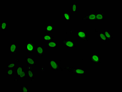 Immunofluorescent analysis of Hela cells using CSB-PA010389PA125ncrHU at dilution of 1:100 and Alexa Fluor 488-congugated AffiniPure Goat Anti-Rabbit IgG(H+L)