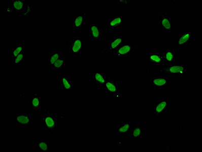 Immunofluorescent analysis of Hela cells using CSB-PA010389PA95nforHU at dilution of 1:100 and Alexa Fluor 488-congugated AffiniPure Goat Anti-Rabbit IgG(H+L)