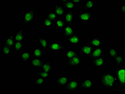 Immunofluorescence staining of Hela cells with CSB-PA010389OA95ncrHU at 1:1, counter-stained with DAPI. The cells were fixed in 4% formaldehyde, permeabilized using 0.2% Triton X-100 and blocked in 10% normal Goat Serum. The cells were then incubated with the antibody overnight at 4°C. The secondary antibody was Alexa Fluor 488-congugated AffiniPure Goat Anti-Rabbit IgG(H+L).
