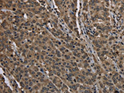 The image on the left is immunohistochemistry of paraffin-embedded Human liver cancer tissue using CSB-PA694551(HIST1H2AH Antibody) at dilution 1/40, on the right is treated with fusion protein. (Original magnification: ×200)