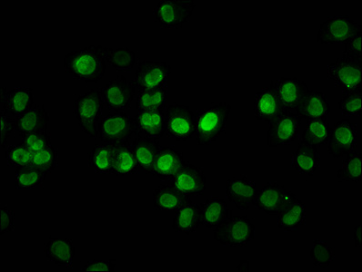 Immunofluorescence staining of Hela cells with CSB-PA010403OA12nacHU at 1:3, counter-stained with DAPI. The cells were fixed in 4% formaldehyde, permeabilized using 0.2% Triton X-100 and blocked in 10% normal Goat Serum. The cells were then incubated with the antibody overnight at 4°C. The secondary antibody was Alexa Fluor 488-congugated AffiniPure Goat Anti-Rabbit IgG(H+L).
