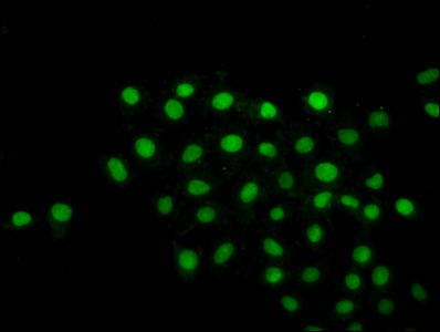 Immunofluorescence staining of Hela cells with CSB-PA010403OA16ncrHU at 1:1, counter-stained with DAPI. The cells were fixed in 4% formaldehyde, permeabilized using 0.2% Triton X-100 and blocked in 10% normal Goat Serum. The cells were then incubated with the antibody overnight at 4°C. The secondary antibody was Alexa Fluor 488-congugated AffiniPure Goat Anti-Rabbit IgG(H+L).