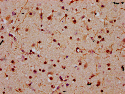 IHC image of CSB-PA010403OA20nbhbHU diluted at 1:10 and staining in paraffin-embedded human brain tissue performed on a Leica BondTM system. After dewaxing and hydration, antigen retrieval was mediated by high pressure in a citrate buffer (pH 6.0). Section was blocked with 10% normal goat serum 30min at RT. Then primary antibody (1% BSA) was incubated at 4°C overnight. The primary is detected by a biotinylated secondary antibody and visualized using an HRP conjugated SP system.