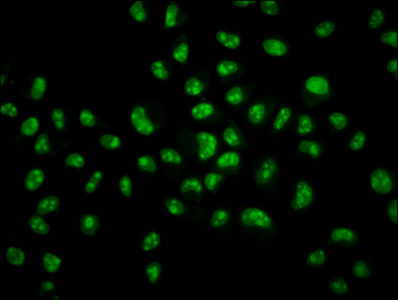 Immunofluorescence staining of Hela cells with CSB-PA010403OA34nsucHU at 1:1, counter-stained with DAPI. The cells were fixed in 4% formaldehyde, permeabilized using 0.2% Triton X-100 and blocked in 10% normal Goat Serum. The cells were then incubated with the antibody overnight at 4°C. The secondary antibody was Alexa Fluor 488-congugated AffiniPure Goat Anti-Rabbit IgG(H+L).