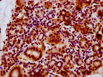 IHC image of CSB-PA010403OA34nsucHU diluted at 1:10 and staining in paraffin-embedded human kidney tissue performed on a Leica BondTM system. After dewaxing and hydration, antigen retrieval was mediated by high pressure in a citrate buffer (pH 6.0). Section was blocked with 10% normal goat serum 30min at RT. Then primary antibody (1% BSA) was incubated at 4°C overnight. The primary is detected by a biotinylated secondary antibody and visualized using an HRP conjugated SP system.
