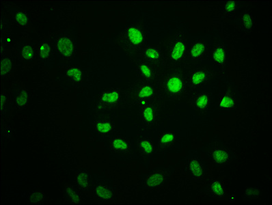 Immunofluorescence staining of Hela cells with CSB-PA010403OA05nbhbHU at 1:1, counter-stained with DAPI. The cells were fixed in 4% formaldehyde, permeabilized using 0.2% Triton X-100 and blocked in 10% normal Goat Serum. The cells were then incubated with the antibody overnight at 4°C. The secondary antibody was Alexa Fluor 488-congugated AffiniPure Goat Anti-Rabbit IgG(H+L).