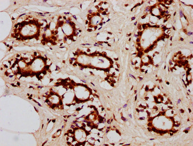 IHC image of CSB-PA010403OA85nacHU diluted at 1:20 and staining in paraffin-embedded human breast cancer performed on a Leica BondTM system. After dewaxing and hydration, antigen retrieval was mediated by high pressure in a citrate buffer (pH 6.0). Section was blocked with 10% normal goat serum 30min at RT. Then primary antibody (1% BSA) was incubated at 4°C overnight. The primary is detected by a biotinylated secondary antibody and visualized using an HRP conjugated SP system.