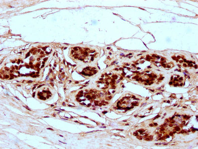 IHC image of CSB-PA010403OA99nme1HU diluted at 1:5 and staining in paraffin-embedded human breast cancer performed on a Leica BondTM system. After dewaxing and hydration, antigen retrieval was mediated by high pressure in a citrate buffer (pH 6.0). Section was blocked with 10% normal goat serum 30min at RT. Then primary antibody (1% BSA) was incubated at 4°C overnight. The primary is detected by a biotinylated secondary antibody and visualized using an HRP conjugated SP system.