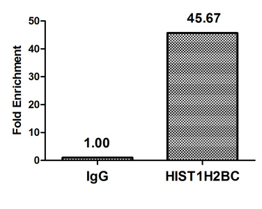 Chromatin Immunoprecipitation Hela (4*106) were treated with Micrococcal Nuclease, sonicated, and immunoprecipitated with 5µg anti-HIST1H2BC (CSB-PA010403OA116nme1HU) or a control normal rabbit IgG. The resulting ChIP DNA was quantified using real-time PCR with primers against the β-Globin promoter.