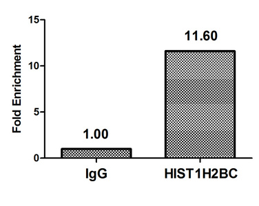 Chromatin Immunoprecipitation Hela (4*106) were treated with Micrococcal Nuclease, sonicated, and immunoprecipitated with 5µg anti-HIST1H2BC (CSB-PA010403OA14nphHU) or a control normal rabbit IgG. The resulting ChIP DNA was quantified using real-time PCR with primers against the β-Globin promoter.