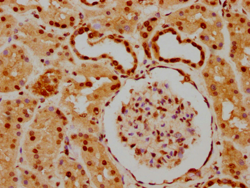IHC image of CSB-PA010403PA05nforHU diluted at 1:20 and staining in paraffin-embedded human kidney tissue performed on a Leica BondTM system. After dewaxing and hydration, antigen retrieval was mediated by high pressure in a citrate buffer (pH 6.0). Section was blocked with 10% normal goat serum 30min at RT. Then primary antibody (1% BSA) was incubated at 4°C overnight. The primary is detected by a biotinylated secondary antibody and visualized using an HRP conjugated SP system.