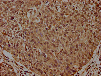IHC image of CSB-PA860357EA01HU diluted at 1:300 and staining in paraffin-embedded human cervical cancer performed on a Leica BondTM system. After dewaxing and hydration, antigen retrieval was mediated by high pressure in a citrate buffer (pH 6.0). Section was blocked with 10% normal goat serum 30min at RT. Then primary antibody (1% BSA) was incubated at 4°C overnight. The primary is detected by a biotinylated secondary antibody and visualized using an HRP conjugated SP system.