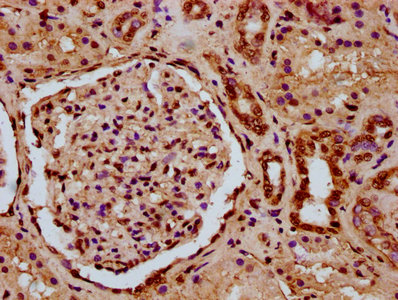 IHC image of CSB-PA010418OA11nphHU diluted at 1:10 and staining in paraffin-embedded human kidney tissue performed on a Leica BondTM system. After dewaxing and hydration, antigen retrieval was mediated by high pressure in a citrate buffer (pH 6.0). Section was blocked with 10% normal goat serum 30min at RT. Then primary antibody (1% BSA) was incubated at 4°C overnight. The primary is detected by a biotinylated secondary antibody and visualized using an HRP conjugated SP system.