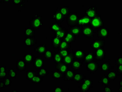 Immunofluorescence staining of Hela cells with CSB-PA010418OA11nphHU at 1:1.3, counter-stained with DAPI. The cells were fixed in 4% formaldehyde, permeabilized using 0.2% Triton X-100 and blocked in 10% normal Goat Serum. The cells were then incubated with the antibody overnight at 4°C. The secondary antibody was Alexa Fluor 488-congugated AffiniPure Goat Anti-Rabbit IgG(H+L).