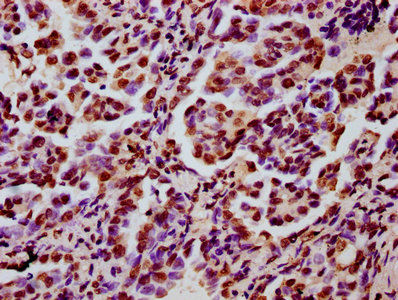 IHC image of CSB-PA010418OA122nacHU diluted at 1:5 and staining in paraffin-embedded human lung cancer performed on a Leica BondTM system. After dewaxing and hydration, antigen retrieval was mediated by high pressure in a citrate buffer (pH 6.0). Section was blocked with 10% normal goat serum 30min at RT. Then primary antibody (1% BSA) was incubated at 4°C overnight. The primary is detected by a biotinylated secondary antibody and visualized using an HRP conjugated SP system.