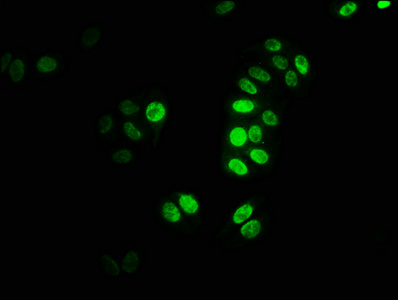 Immunofluorescence staining of HepG2 cells with CSB-PA010418OA122nacHU at 1:2.5, counter-stained with DAPI. The cells were fixed in 4% formaldehyde, permeabilized using 0.2% Triton X-100 and blocked in 10% normal Goat Serum. The cells were then incubated with the antibody overnight at 4°C. The secondary antibody was Alexa Fluor 488-congugated AffiniPure Goat Anti-Rabbit IgG(H+L).