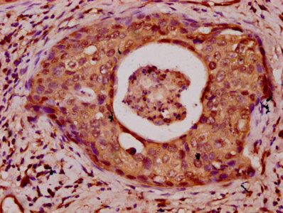 IHC image of CSB-PA010418OA23npropHU diluted at 1:50 and staining in paraffin-embedded human cervical cancer performed on a Leica BondTM system. After dewaxing and hydration, antigen retrieval was mediated by high pressure in a citrate buffer (pH 6.0). Section was blocked with 10% normal goat serum 30min at RT. Then primary antibody (1% BSA) was incubated at 4°C overnight. The primary is detected by a biotinylated secondary antibody and visualized using an HRP conjugated SP system.