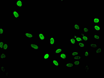 • Immunofluorescent analysis of Hela cells using CSB-PA010418OA36nme3HU at dilution of 1:100 and Alexa Fluor 488-congugated AffiniPure Goat Anti-Rabbit IgG(H+L)
